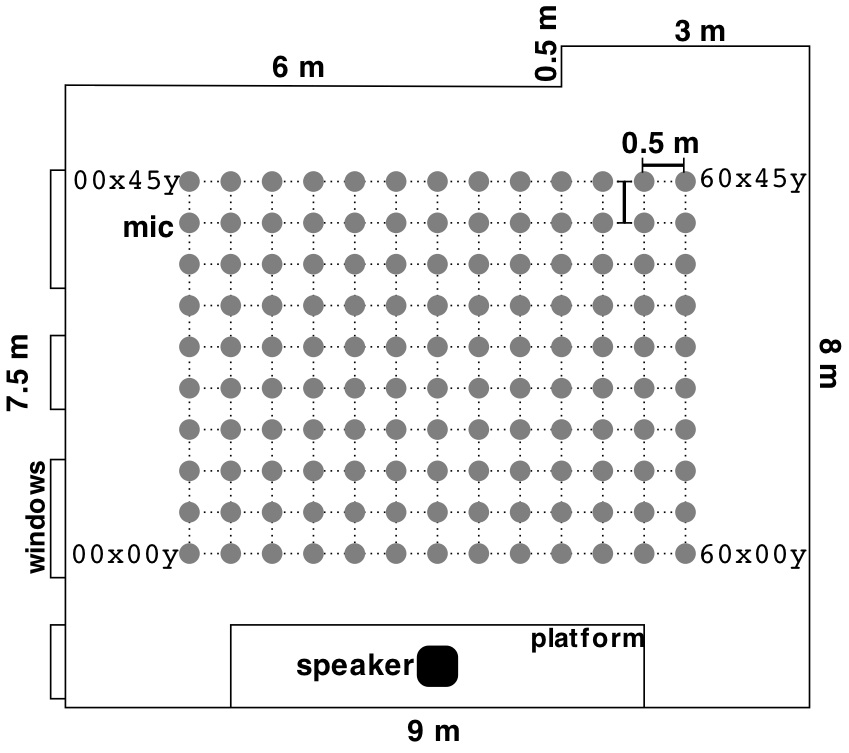 A set of 130 IRs were taken within a classroom in the School of Electronic Engineering and Computer Science. The room measures roughly 7.5 x 9 x 3.5 m (236 cubic m) with reflective surfaces of a linoleum floor, painted plaster walls and ceiling, and a large whiteboard. When in use for lectures the room is filled with desks and chairs. These were stacked and moved to the side against the windows during the measurements. Measurements are 50 cm apart arranged in 10 rows and 13 columns relative to the speaker, with the 8th column directly on axis with the speaker.