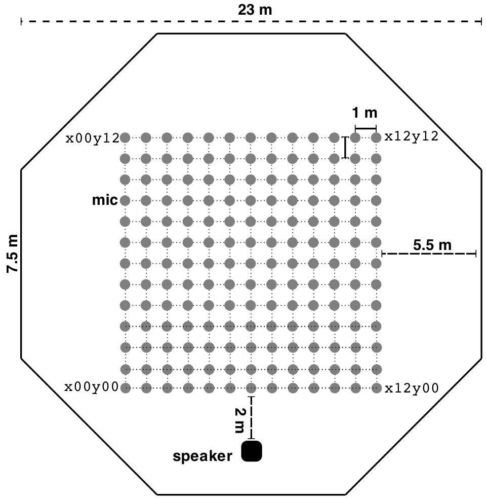 The Great Hall is a multipurpose hall that can hold approximately 800 seats. The hall has a stage and seating areas on the floor and a balcony. The microphones were placed in the seating area on the floor, roughly a 23 m x 16 m area, which was cleared of chairs. The microphone positions are identical to the layout for the Octagon, 169 IRs over a 12 m x 12 m area. The room is significantly bigger than the measuring area as the balcony extends 20 m past the rear wall.